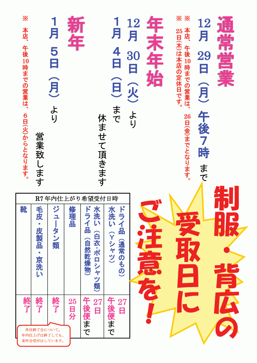 2025~2026年、富士屋クリーニングの年末年始お知らせ 2025/12/10 2025~2026年 富士屋クリーニング、令和7~8年の年末年始お休みのお知らせ 富士屋クリーニング本店の年末年始のお休みのお知らせです。 2025~2026年の本店、年末年始お休み 2025年12月30日(火)~ 2026年1月4日(日)まで 法泉店は 2025年12月29日(月)~ 2026年1月5日(月)まで となります。 画像は本店のお休みを表記しています。 お間違えの無いようご注意ください。 2025年も色々とありました。 来年が良い年でありますように。 そして皆様も良い年末を迎えられますよう、お祈りいたします。