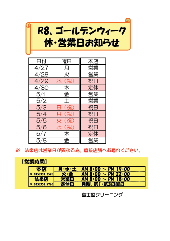 R8年、富士屋クリーニングのゴールデンウイーク営業予定表 2026/04/27 お急ぎの品は日付にご注意を 富士屋クリーニング、R8年ゴールデンウイークの営業予定表です 富士屋クリーニング、R8年ゴールデンウイークの予定です。 お急ぎのお品物などについては直接店舗にお電話にてご連絡ください。 (その方がメールで確認するよりも早いため、推奨しております) 宅配に関しましても同じく、お電話にてご確認ください。 今年は休みが多くなっています。 お預けとお引取りの日付にご注意ください。 よろしくお願いいたします。
